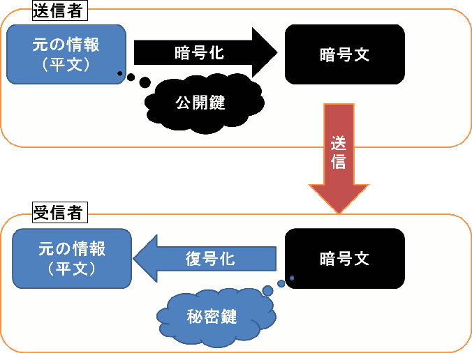 秘密鍵で暗号化すると秘密鍵では復号化できない。 - 公開鍵で暗号化すると秘密鍵でしか復号化できない。