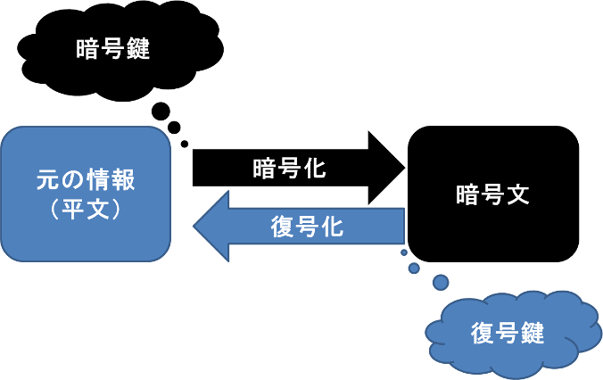 暗号鍵と復号鍵という2つの鍵があるので、この取り扱いにより、暗号方式が異なります。次回は、共通鍵暗号方式についてお話します。